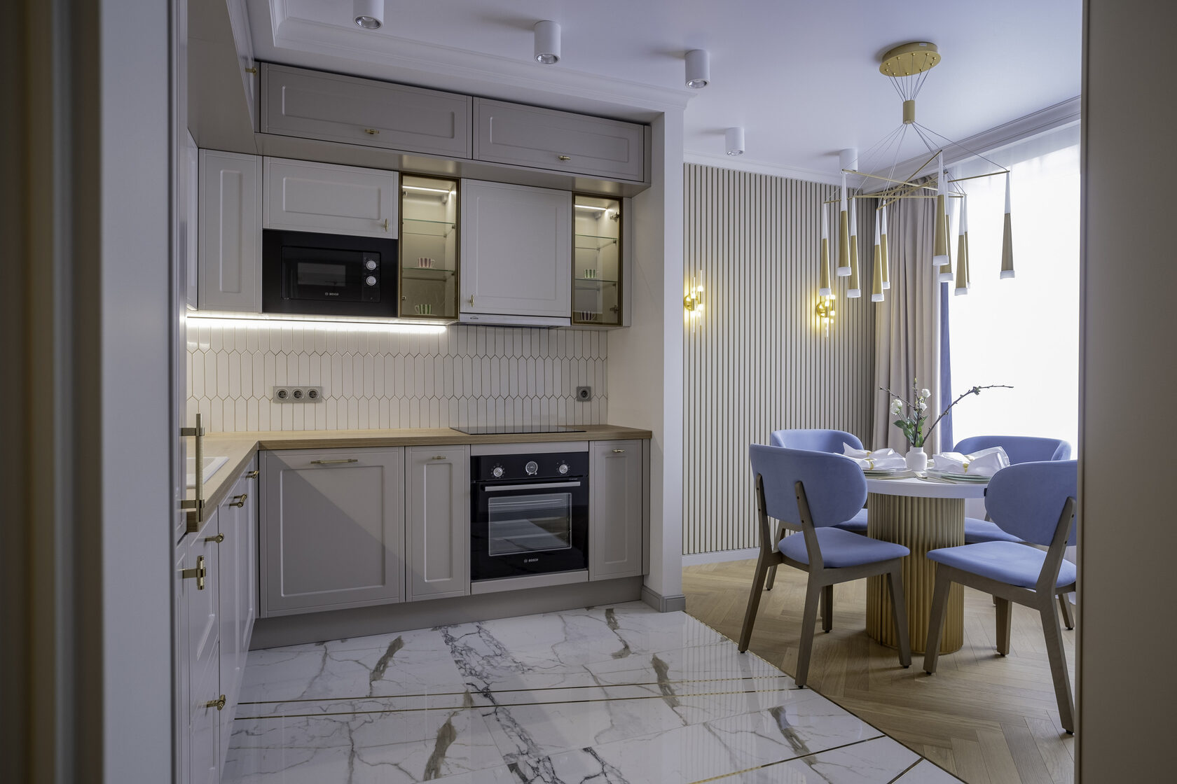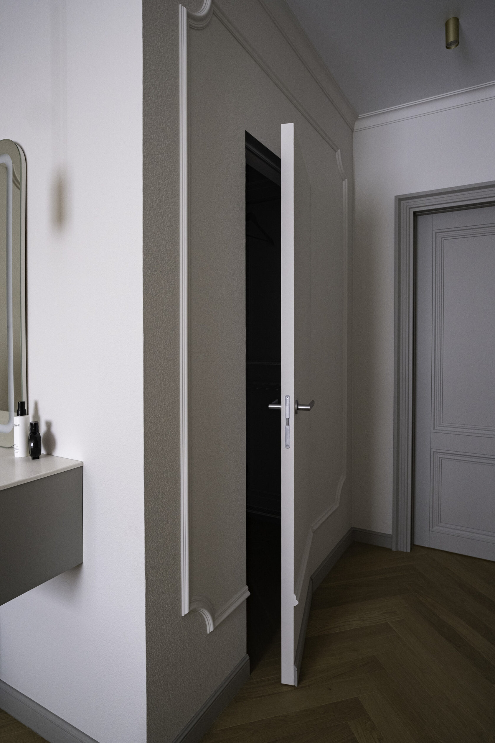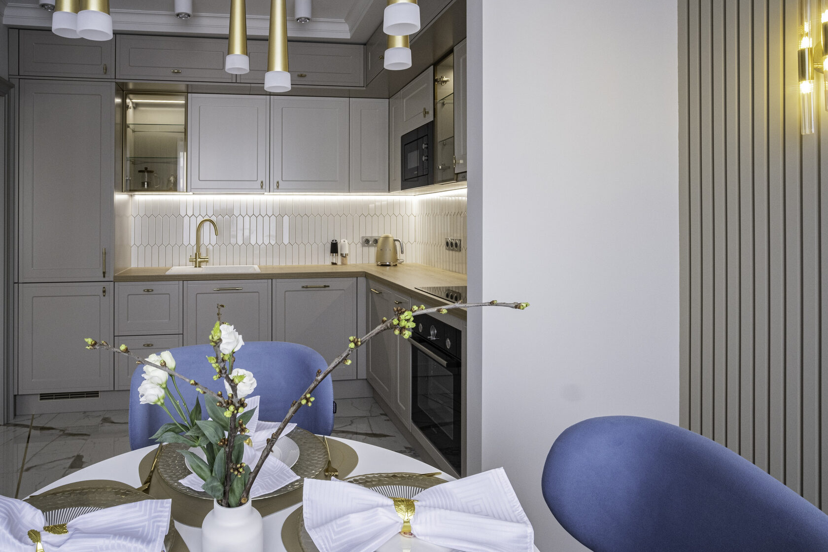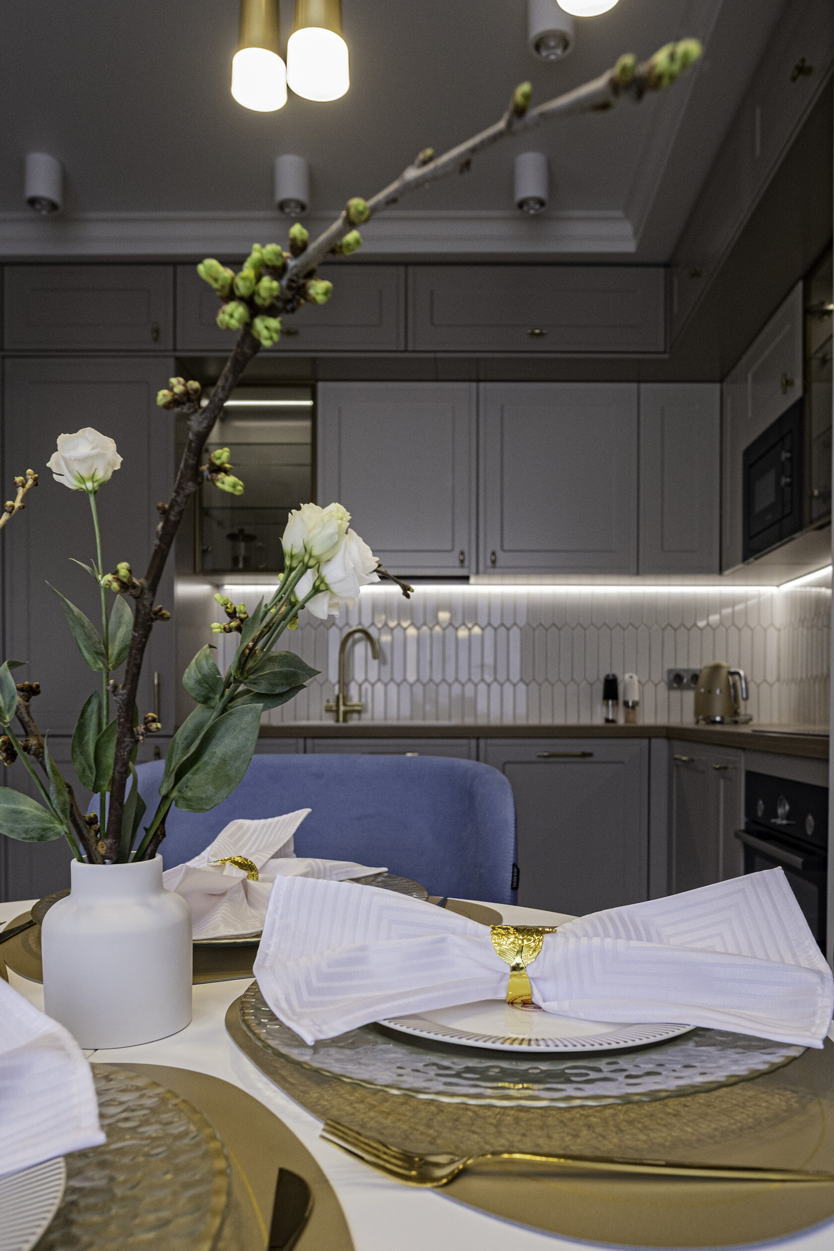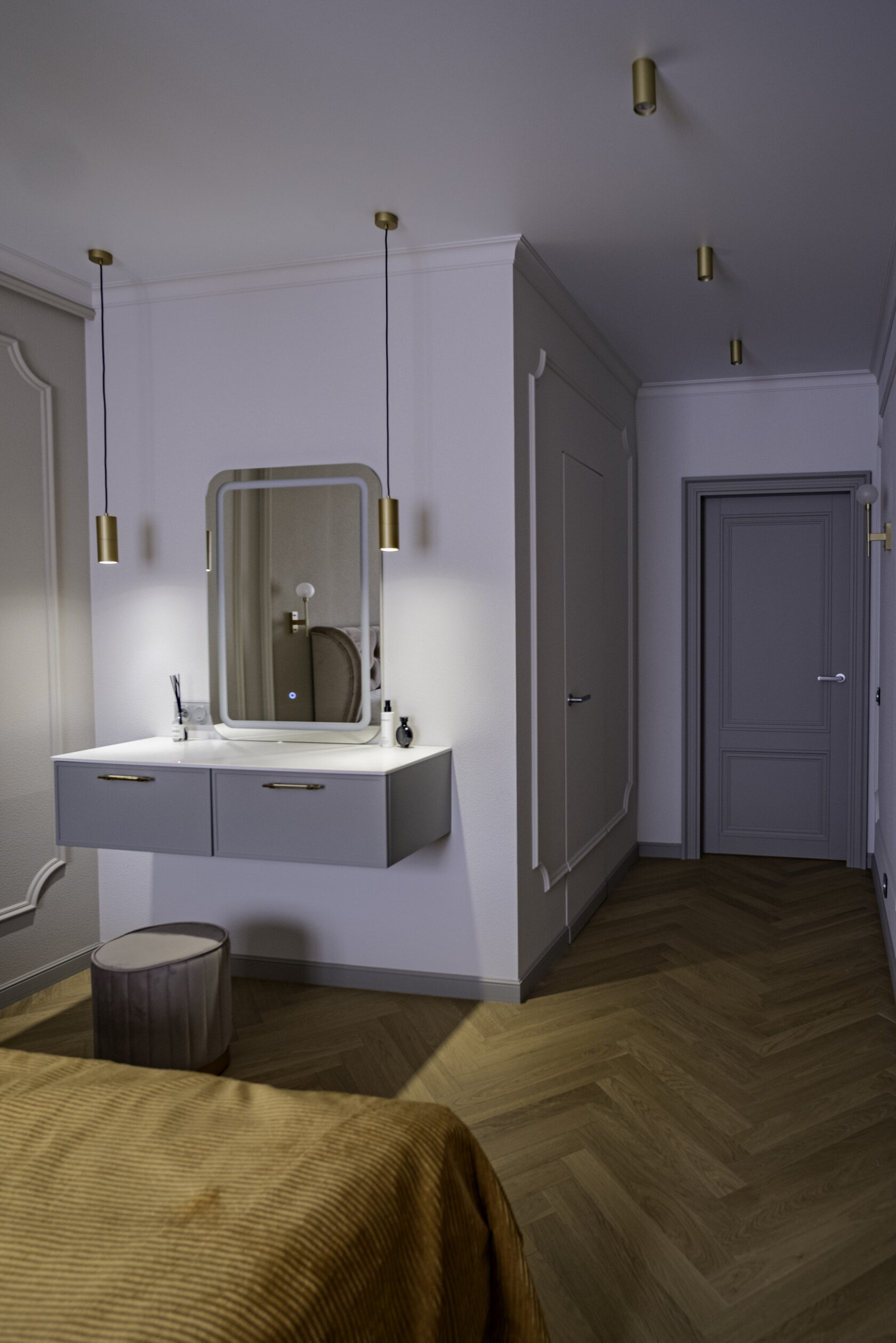 Проект для взрослой семейной пары. Когда все дети уже взрослые и живут отдельно, то квартира нужна просто для удовольствия и комфортной жизни. Именно поэтому в этой квартире очень много воздуха и есть место для всего: отдельная столовая и гостиная, зоны хранения, большие санузлы, просторные спальни.